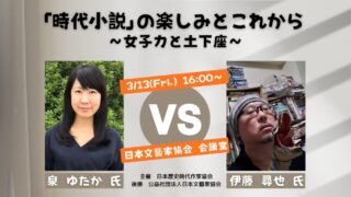 イベント3月13日(金)「時代小説」の楽しみとこれから~女子力と土下座 「時代小説」の楽しみとこれから――女子力と土下座パネラー:泉ゆたか × 伊藤尋也司会:羽鳥好之時代小説は主に江戸時代を舞台にしたエンターテインメントですが、多くの作家は、現代にも通じる問題意識を作品に込めています。時代小説は、現在に対して何... 2026.01.14お知らせイベント